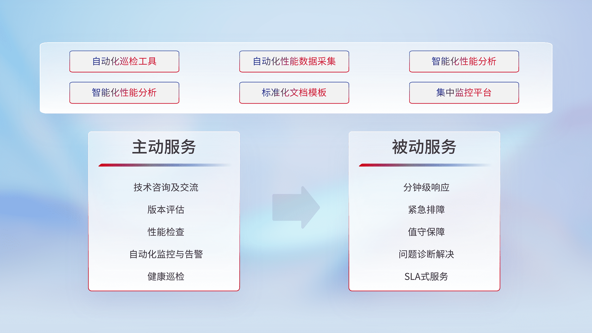 智能化工具和标准化文档,,,,保障服务质量,,,提供主动服务(包含技术咨询、、、版本评估、、、性能检查、、、、自动化监控与告警、、、健康巡检)和被动服务包含(分钟级响应、、、、紧急排障、、值守保障、、、问题诊断解决、、SLA服务)。。。。
