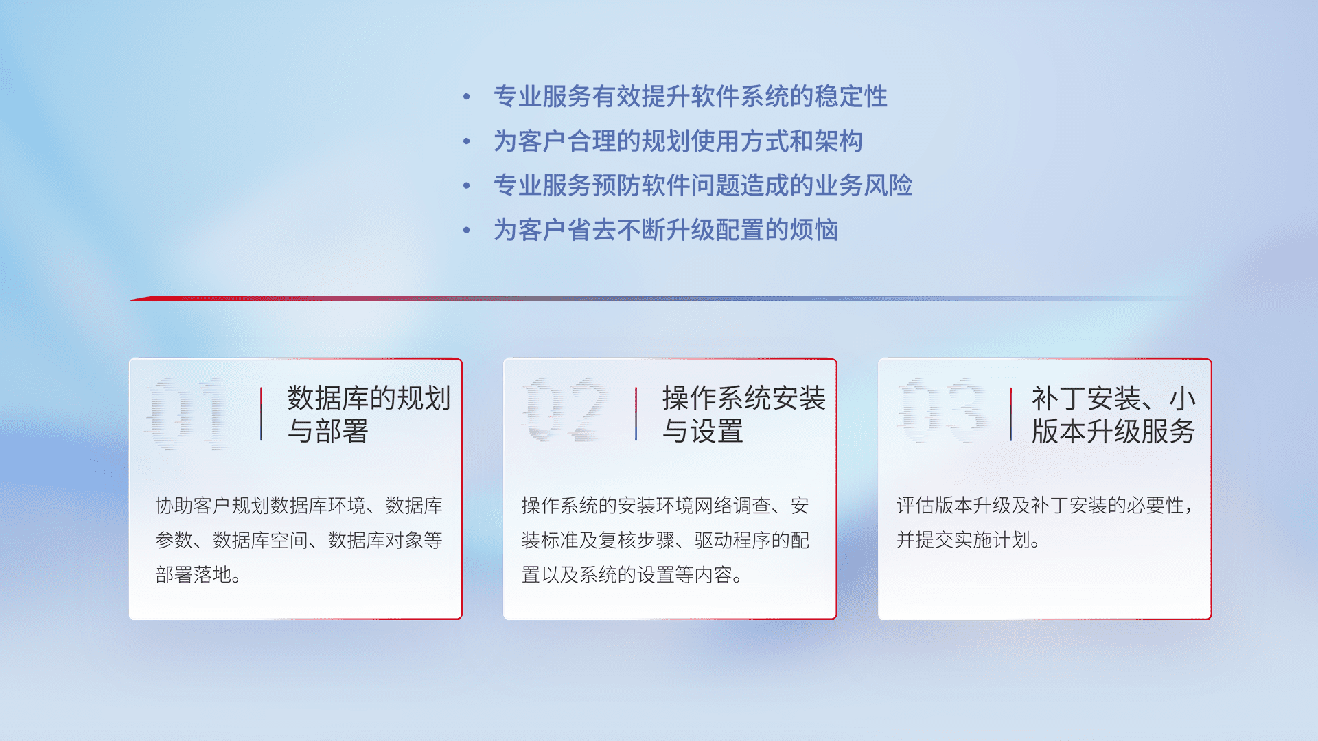 为客户提供软件规模升级、、、、快速部署、、、按需配置的专业服务,,从数据库的规划与部署到操作系统的安装与设置,,,,再到补丁安装和小版本升级提供支持。。。